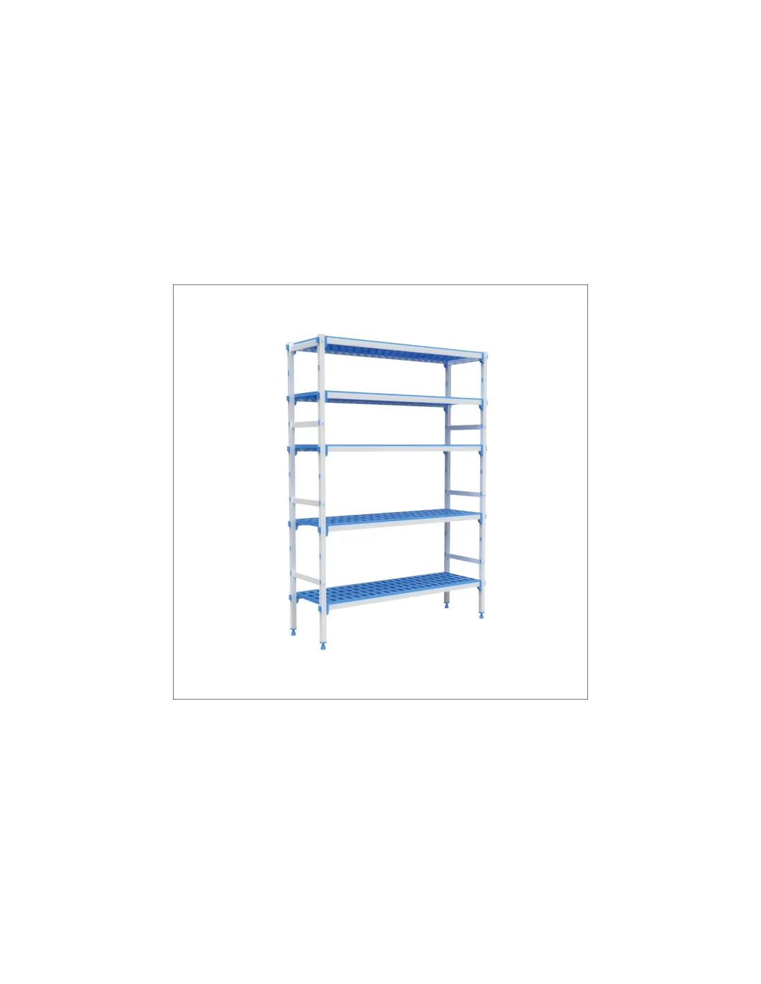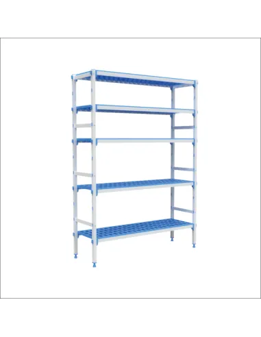 Estantería modular de 5 niveles, 1840×385×1750 mm, aluminio anodizado, resiste -30ºC a +75ºC, estantes de polietileno aptos para alimentos.