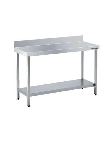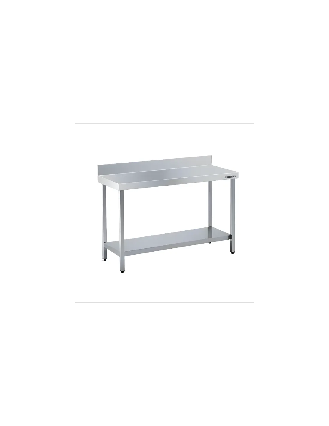 Mesa mural 2400×700×850 mm, acero inoxidable AISI 304, estante inferior, refuerzos, peto posterior 105 mm, patas ajustables 850-900 mm.