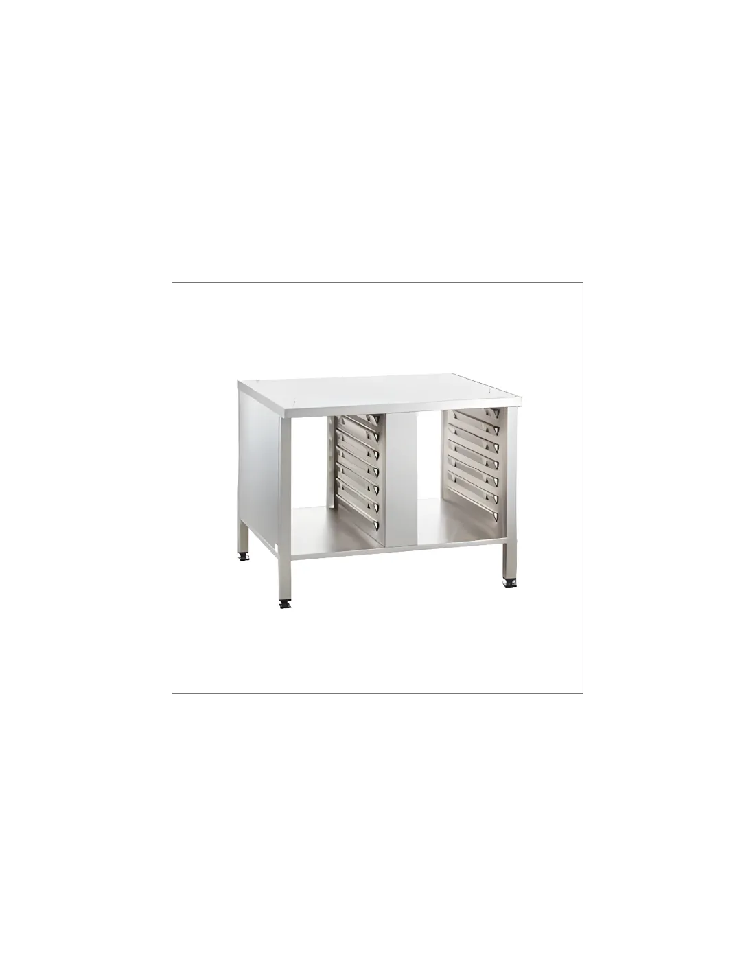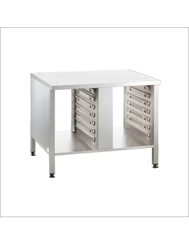 The Rational Combi Duo XS 6-2/3 combined oven is complemented by the Combi-Duo Table II, designed to optimize space and functionality in horeca environments. This table features four pairs of support rails and a compartment, allowing open access from both sides thanks to its side panels. Its standard dimensions are 639 mm wide, 563 mm deep, and 556 mm high, ensuring efficient integration in professional kitchens. Made of durable materials, it ensures stability and resistance in daily use.