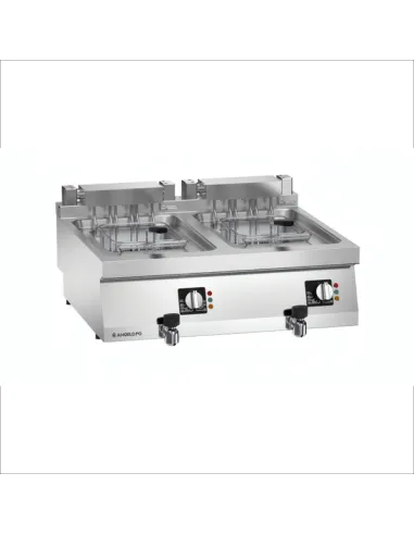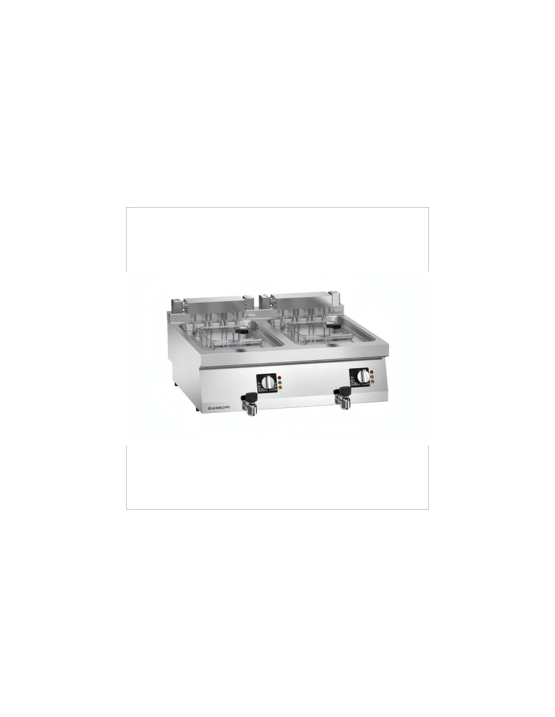 La freidora eléctrica ICON700 de Angelo Po cuenta con dos cubas de 11 litros cada una, fabricadas en acero inoxidable AISI304 con un espesor de 20/10 mm. Las cubas están estampadas y soldadas, ofreciendo amplias zonas de escurrido y decantación de aceite. Cada cuba incluye un cesto y una tapa. El control de temperatura se realiza mediante un termostato ajustable de 100 a 190 °C. Las resistencias son volcables para facilitar la limpieza. Funciona con voltajes de 400V 3N~ o 230V 3~, y tiene dimensiones de 80x72x25 cm y un peso de 41 kg.