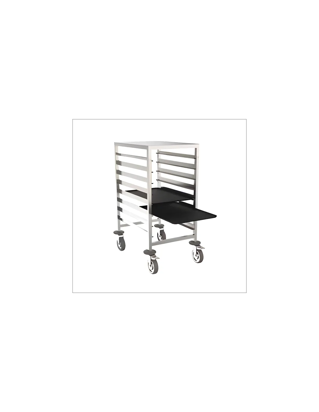 The Distform reinforced low pastry trolley, with dimensions of 537×700×990 mm, is made of AISI 304 18/10 stainless steel, ensuring durability and resistance. Designed to accommodate 16 pastry trays of 600x400 mm, it features 8 pairs of guides with a separation of 85 mm. Equipped with 4 Ø125 mm wheels, two of them with brakes, and bumpers for added safety and maneuverability. Ideal for demanding environments in the horeca sector, offering efficiency in the transportation and storage of pastry products.
