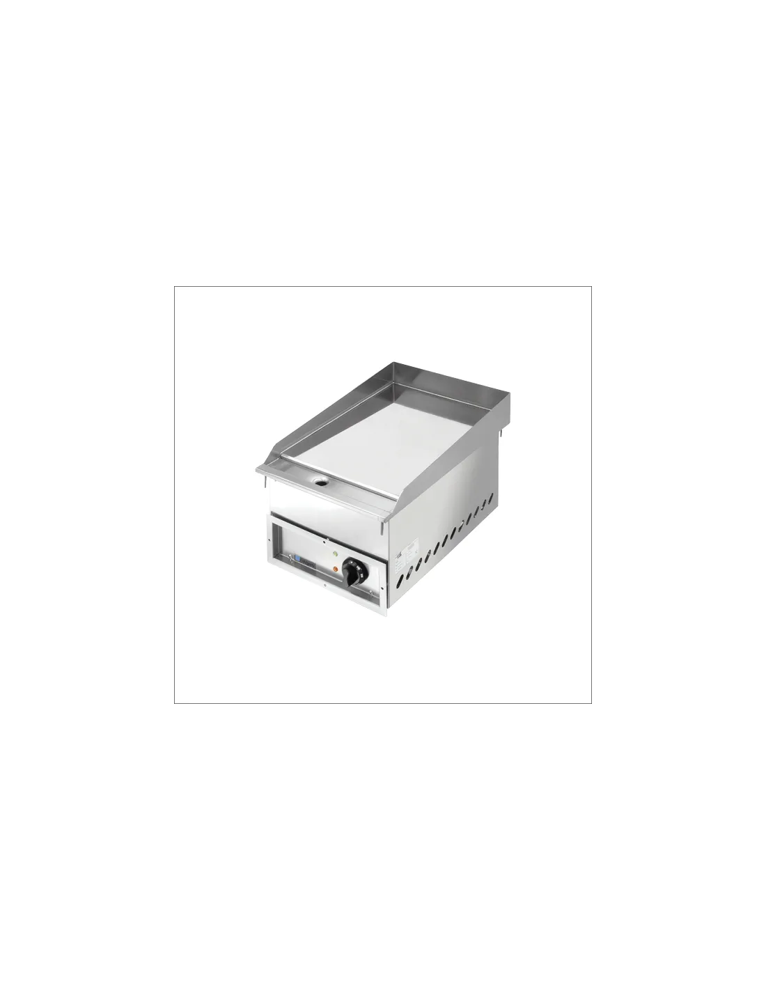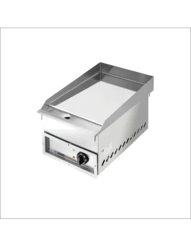 Fry-top gas encastrable con plancha de cromoduro, quemadores 6 kW, borde anti-derrames, cajón de residuos, panel móvil. Dimensiones: 400x700x290 mm.