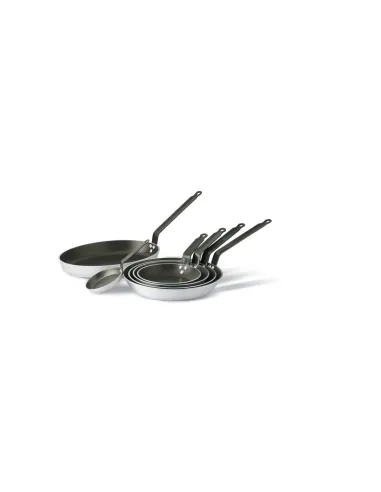 Range of professional thick aluminum pans (between 3 and 5 mm) with multi-layer non-stick coating. Extra resistant riveted strip handle with hanging hole. Excellent heat transmission and distribution. - 1 Pancake: 12cm - 1 Oval: 36 cm - 4 Round: 20, 24, 28, and 32cm