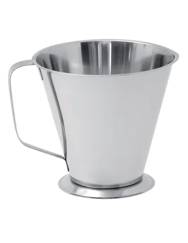 Graduated stainless steel measuring jug, measuring 17x14x14 cm and with a capacity of 1 L, equipped with a base and handle for controlled pouring.