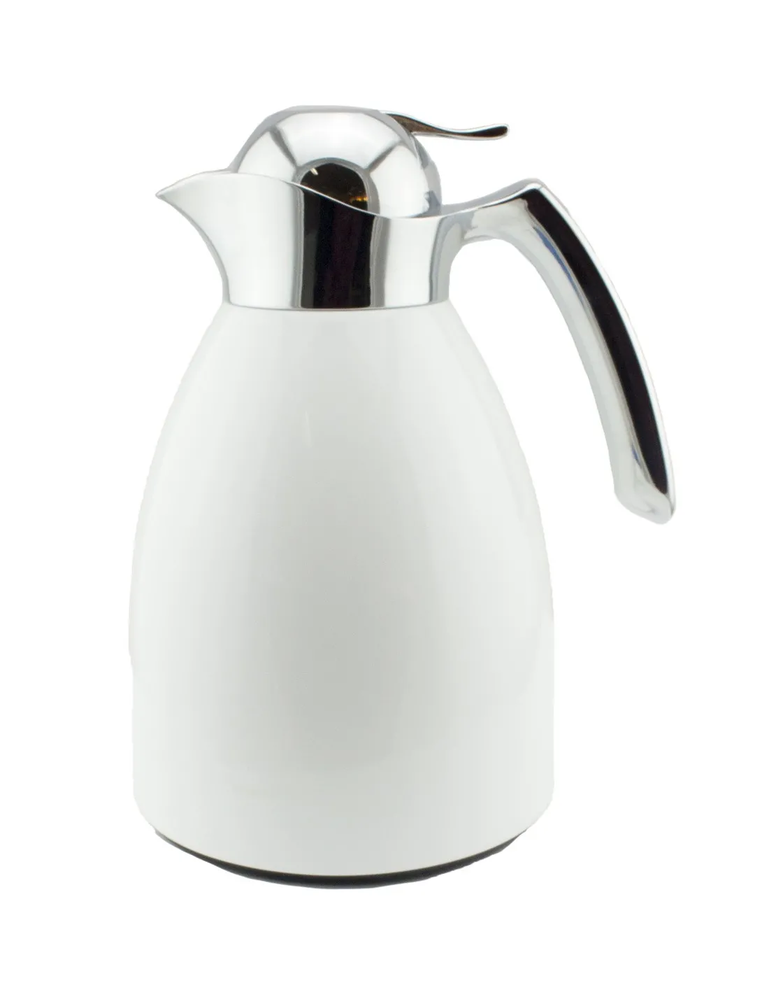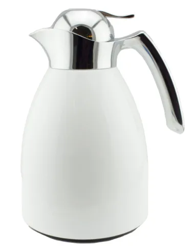 White stainless steel thermal jug of 1 L with durable color coating. Insulated by double-walled glass flask with air vacuum.