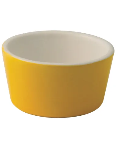 The glazed yellow round stoneware ramekin with a diameter of 7 cm is a professional catering utensil. Resistant up to 200°C, suitable for microwave, oven, and dishwasher, it is ideal for sauces,...