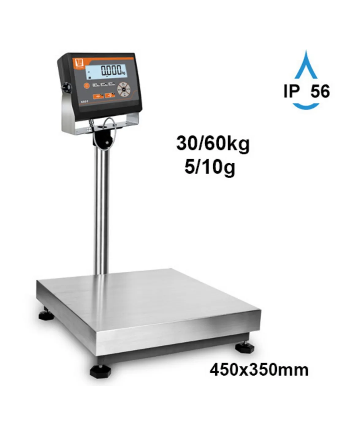 Reception scale for dry environment IP56. Structure and platform in epoxy-coated steel, aluminum sensor. Platform coated in stainless steel. Built-in battery (70h autonomy at full charge). Removable power supply from the grid. Operating temperature +10° to +40°C. For dry environment. Functions: weighing, tare, 20 tare memories, counting, control +/-. RS232 output for PC or printer. Stainless steel wall mount included. Stainless steel column stand included (H:35cm)