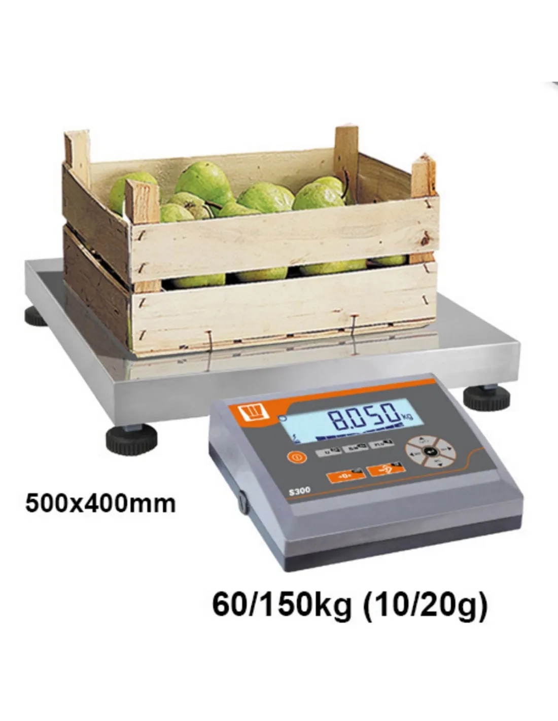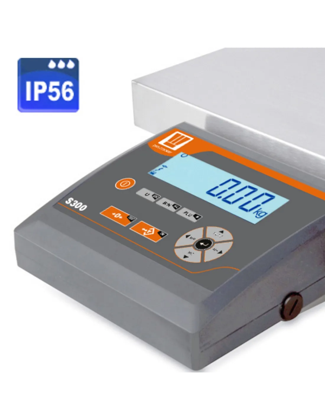 Reception scale for dry environments with IP54 protection. Backlit LCD screen of 2.5 cm. Mains or rechargeable battery power supply (70h autonomy). Two mounting modes: on platform or wall. Epoxy steel and stainless steel structure. Waterproof ABS indicator. Functions: weighing, tare, 20 tare memories, counting, totalizing, +/- control, SRS232 output for PC/printer.