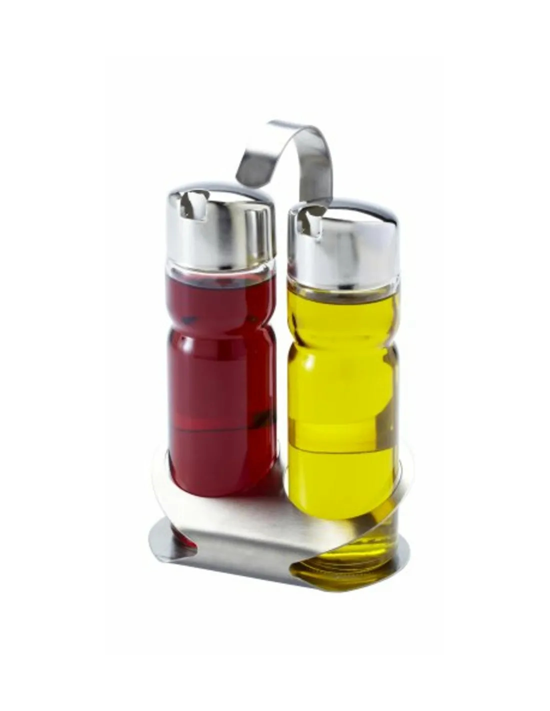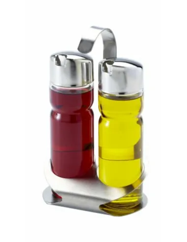 The glass oil/vinegar set 12x8x19 cm Nova Pro.mundi is a practical set for the hospitality industry, featuring an anti-drip system, transparent glass bottles with stainless steel caps, and a stainless steel stand. Compact and durable, it facilitates service while ensuring purity of flavor and elegance.