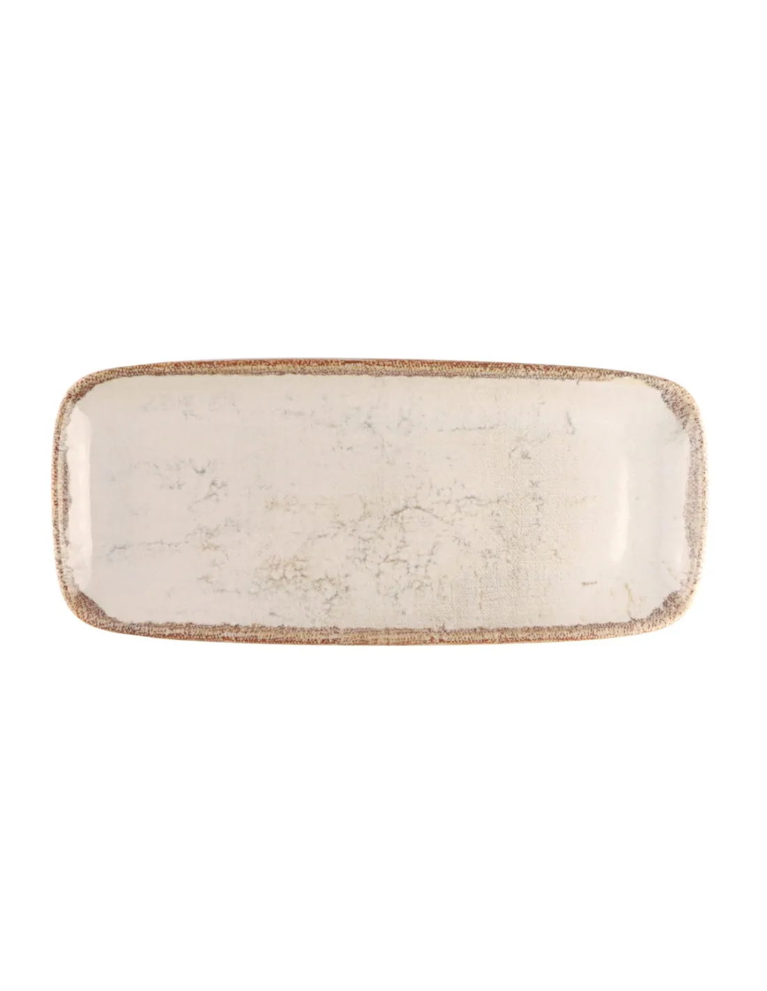 Rectangular glazed stoneware source, 28 cm long, beige color with dark brown veins. Resistant to thermal shocks, stackable, and suitable for dishwasher and microwave. Designed for intensive use.