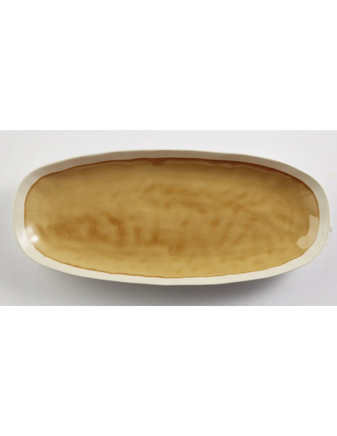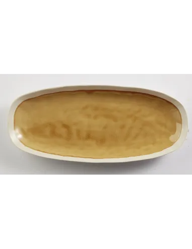 The 30.5 cm Winter oval yellow glazed stoneware plate Pro.mundi is part of the Winter collection, combining craftsmanship and modernity with a crackled glaze and matte white edges. Heat and shock resistant, it is ideal for professional catering, offering a warm aesthetic and great durability to enhance your culinary presentations.