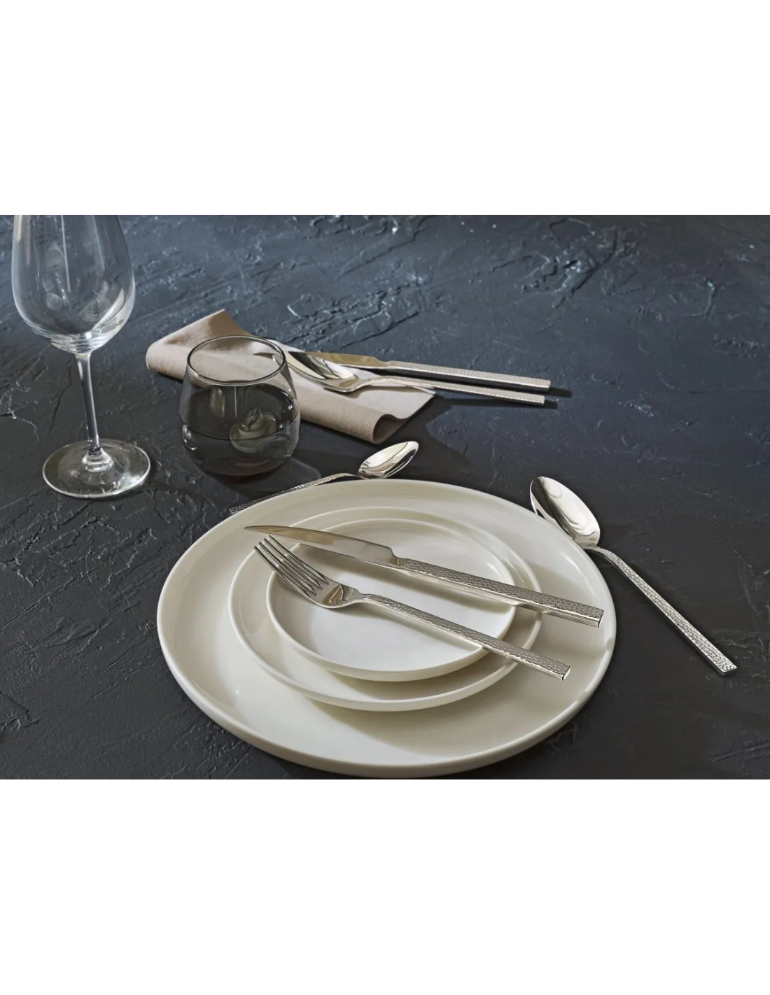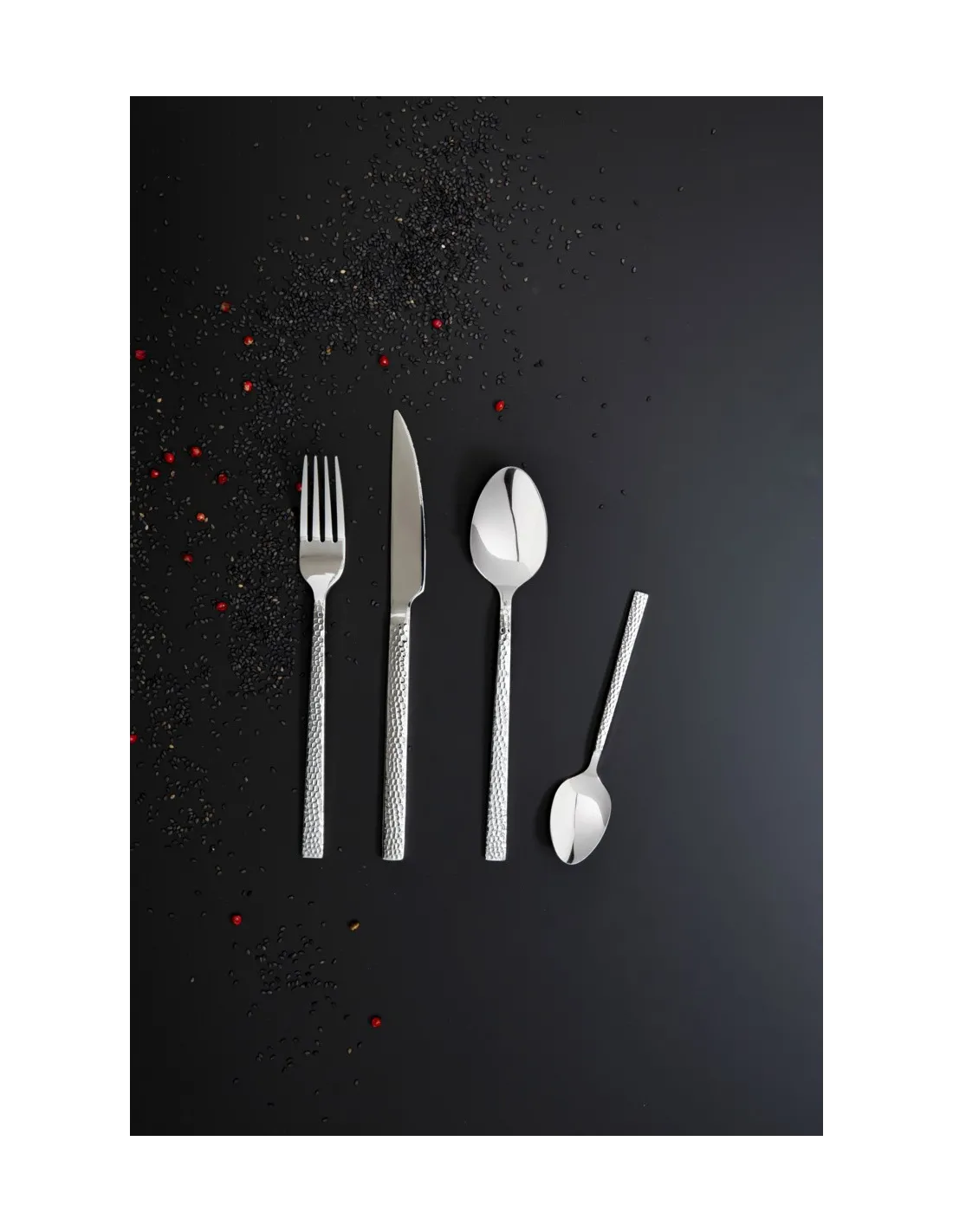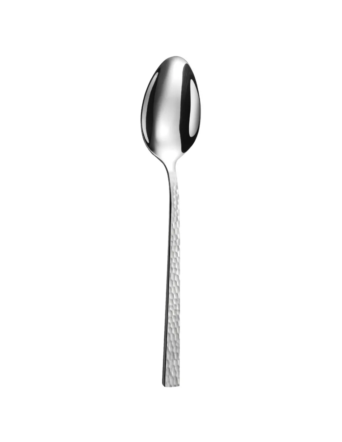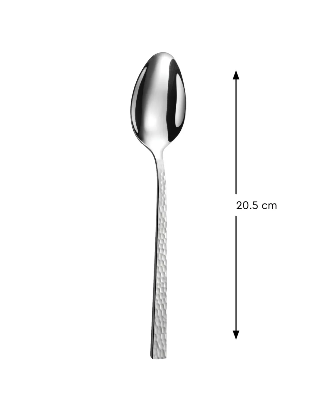 18/0 stainless steel dinner spoon, 20.5 cm, with a hammered handle. It offers robustness and aesthetics, resists corrosion and hides fingerprints, elegantly integrating into professional tables.