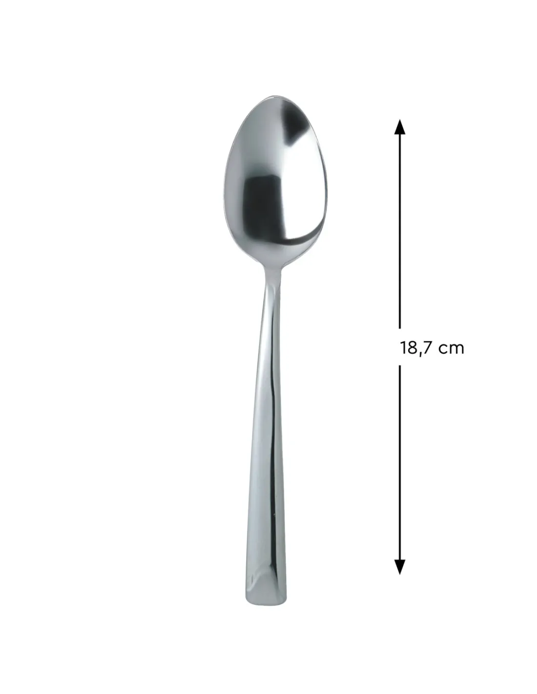 Stainless steel 18/0 dessert spoon, with a length of 18.7 cm. Designed for intensive professional use, it is corrosion-resistant and easy to maintain. Its simple design and beveled handle provide...