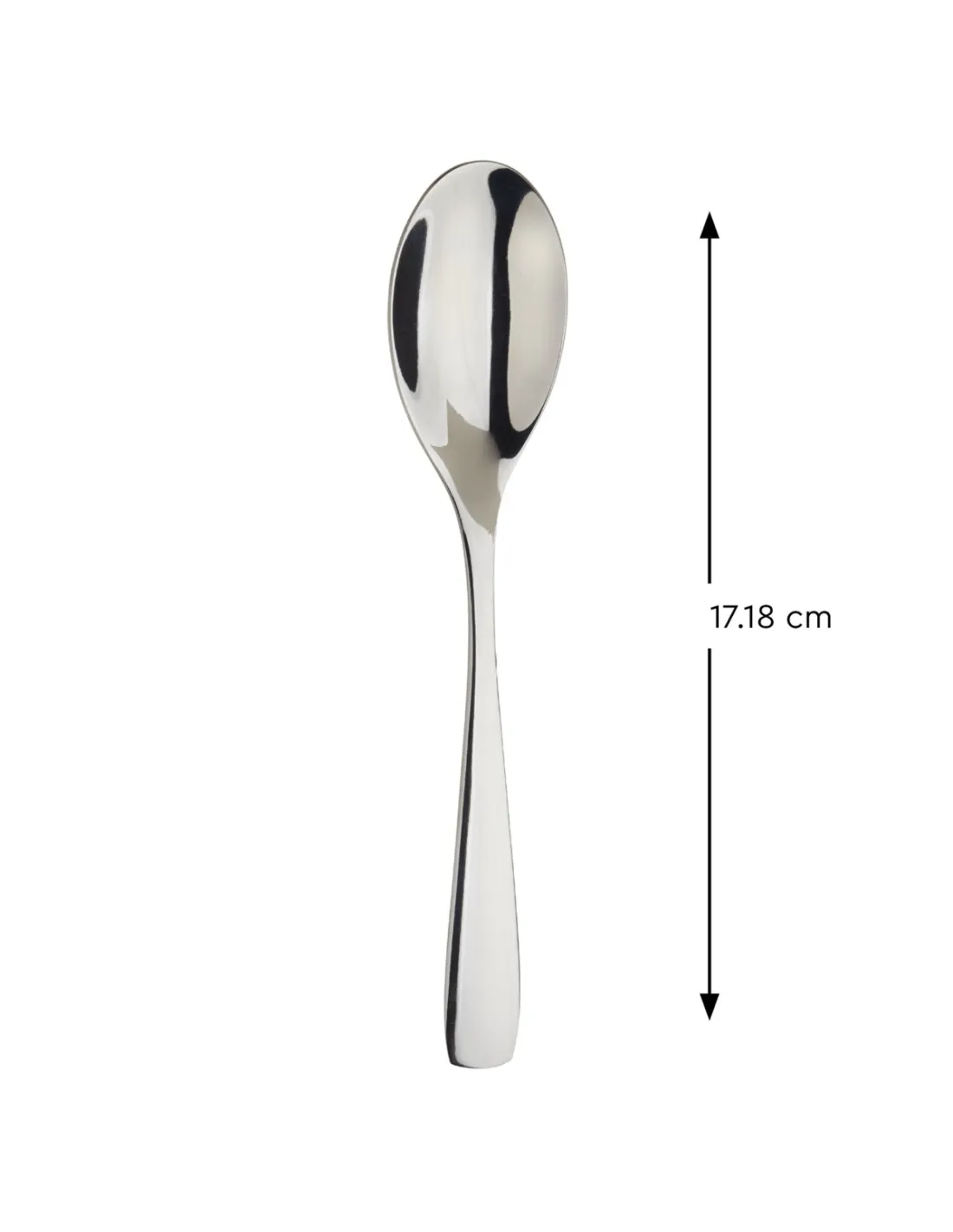 Stainless steel 18/0 dessert spoon, with a length of 17.18 cm. Neutral design and wide handle that provides a good grip. Corrosion-resistant steel with a shiny finish, suitable for professional...