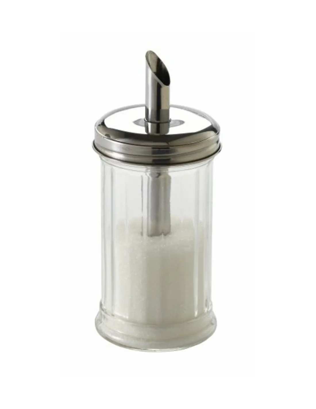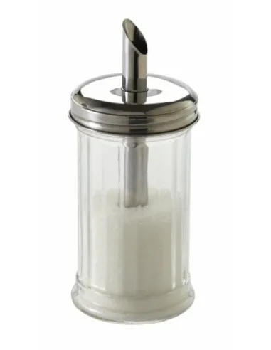 Transparent glass sugar dispenser, 16.5 cm in height and 7.5 cm in diameter, designed for sugar service. It features a stainless steel pouring spout that ensures precise pouring. Its easy cleaning...
