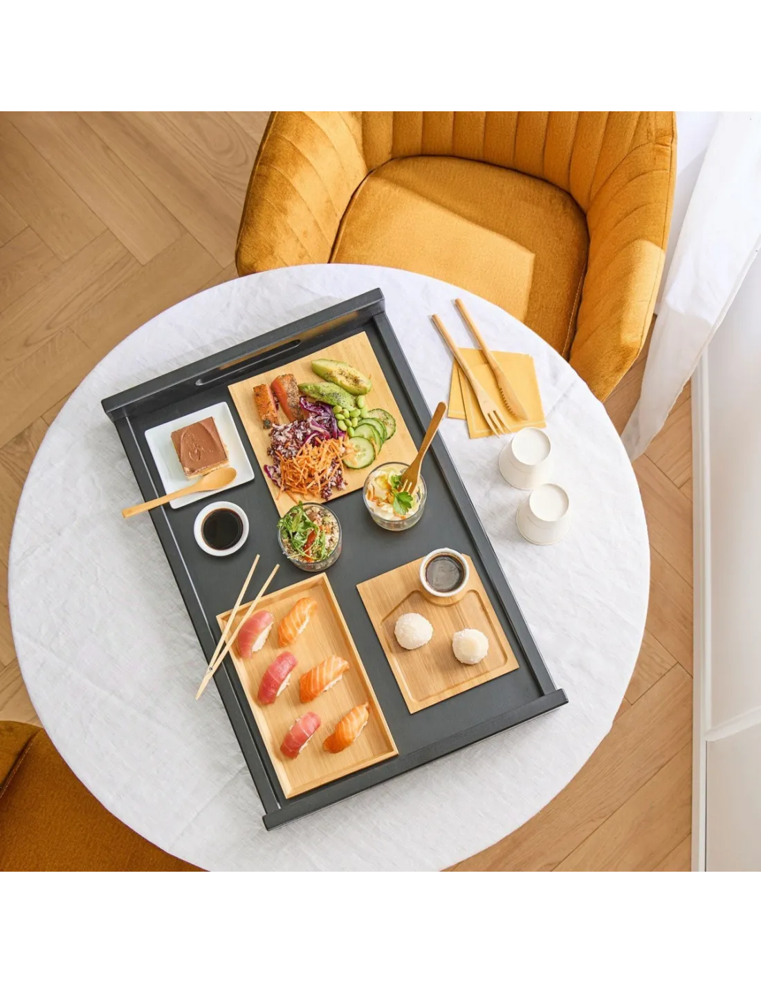 The Pro.mundi black wooden tray, measuring 60 x 40 x 7 cm, is designed for use in room service, buffets, or receptions. It allows for the transportation of meals, drinks, or accessories in a professional setting. Made of black-painted wood, it features ergonomic side handles that make it easy to grip and move. Its stable structure and generous size ensure a suitable serving surface for different setups. This tray is suitable for regular use in the hospitality and restaurant industry. It fits seamlessly into any environment thanks to its sleek and functional finish. Maintenance can be done with a damp sponge or white vinegar for grease. Manual cleaning is recommended to preserve the wood's structure and finish. Designed for foodservice professionals, this Pro.mundi tray combines practicality, stability, and easy maintenance for efficient daily service.