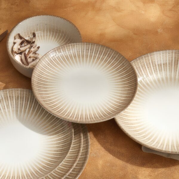 Su decoración en relieve marrón del exterior acentúa el aspecto táctil y visual del plato. Este esmalte brillante aporta un toque natural y auténtico que realza los colores y las texturas de sus platos, manteniendo una estética limpia y sofisticada.
