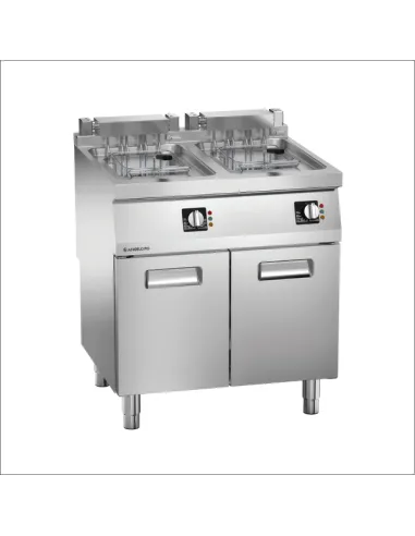 La freidora eléctrica ICON7000 de Angelo Po cuenta con dos cubas de 11 litros cada una, fabricadas en acero inoxidable AISI304 con un espesor de 20/10 mm. Las cubas están estampadas y soldadas, ofreciendo amplias zonas de escurrido y decantación de aceite. Cada cuba incluye un cesto y una tapa. Los mandos mecánicos permiten un control preciso de la temperatura mediante termostato, ajustable entre 100 y 190ºC. Las resistencias volcables facilitan la limpieza. Funciona con 400V 3N~ / 230V 3~ a 50-60 Hz. Dimensiones: 80x72x90 cm. Peso: 82 kg.