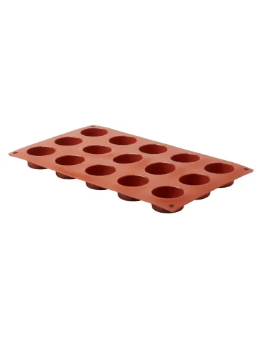 Placa de silicona para 15 petits fours redondos, diseñada según normas alimentarias. Dimensiones totales: 29,5x17,5 cm. Cavidades de Ø 4 cm y H 2 cm, con capacidad de 3 cl cada una.