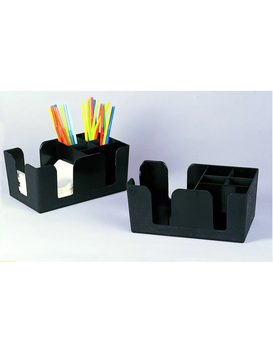 Porta-accesorios negro de plástico resistente, con medidas de 10,5 cm, diseñado con compartimentos separados para almacenar pajitas, agitadores de cóctel, servilletas, decoraciones de cóctel y...