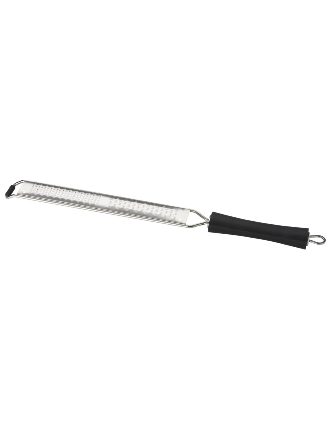 Rallador de acero inoxidable de 40 cm con mango ergonómico de elastómero termoplástico y base antideslizante. Superficie útil: 22 x 3,5 cm. Diseñado para rallar queso, chocolate y verduras.