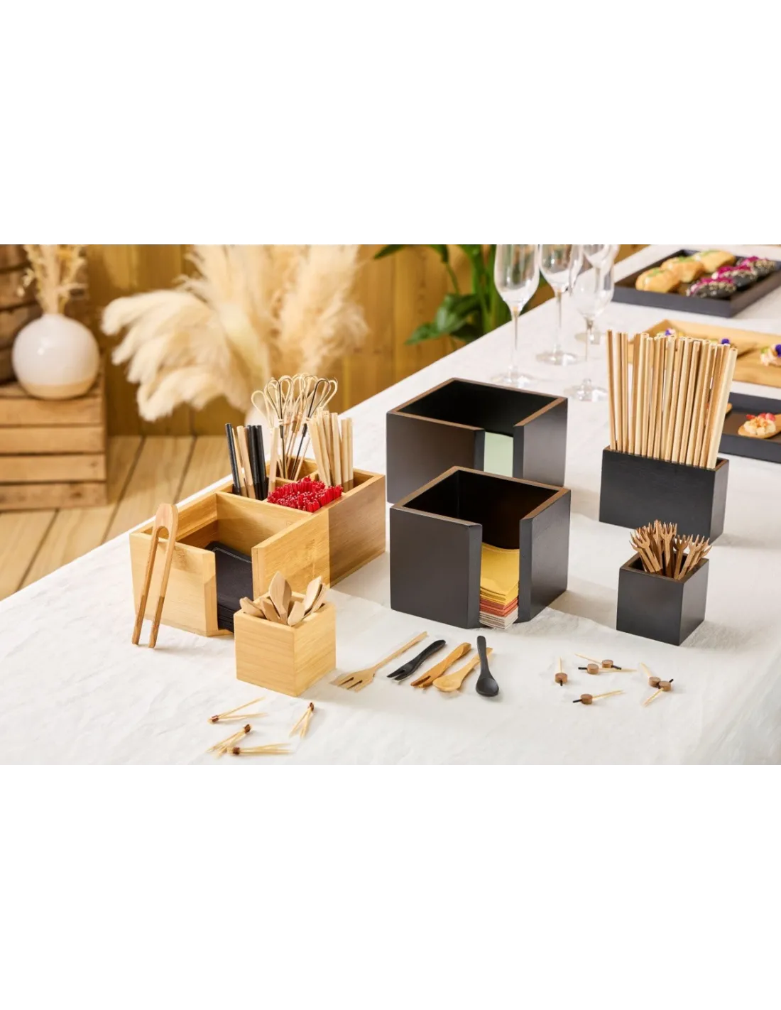 Recipiente rectangular de bambú natural (12x4x8 cm) diseñado para organizar accesorios de servicio. Fácil de integrar en buffet o mostrador, es estable y se limpia a mano con esponja húmeda y vinagre blanco. Ideal para profesionales que buscan un contenedor práctico, apilable y discreto.