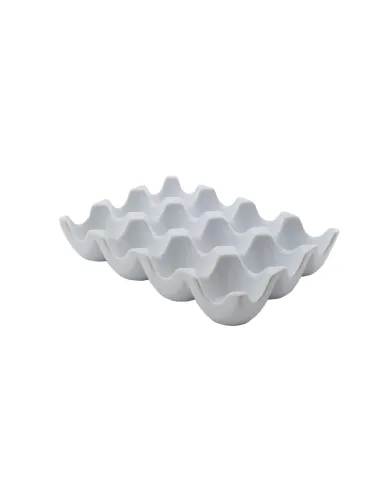Soporte alveolado rectangular de porcelana blanca, con capacidad para 12 huevos, diseñado para presentaciones en buffet. Medidas: 19 cm.