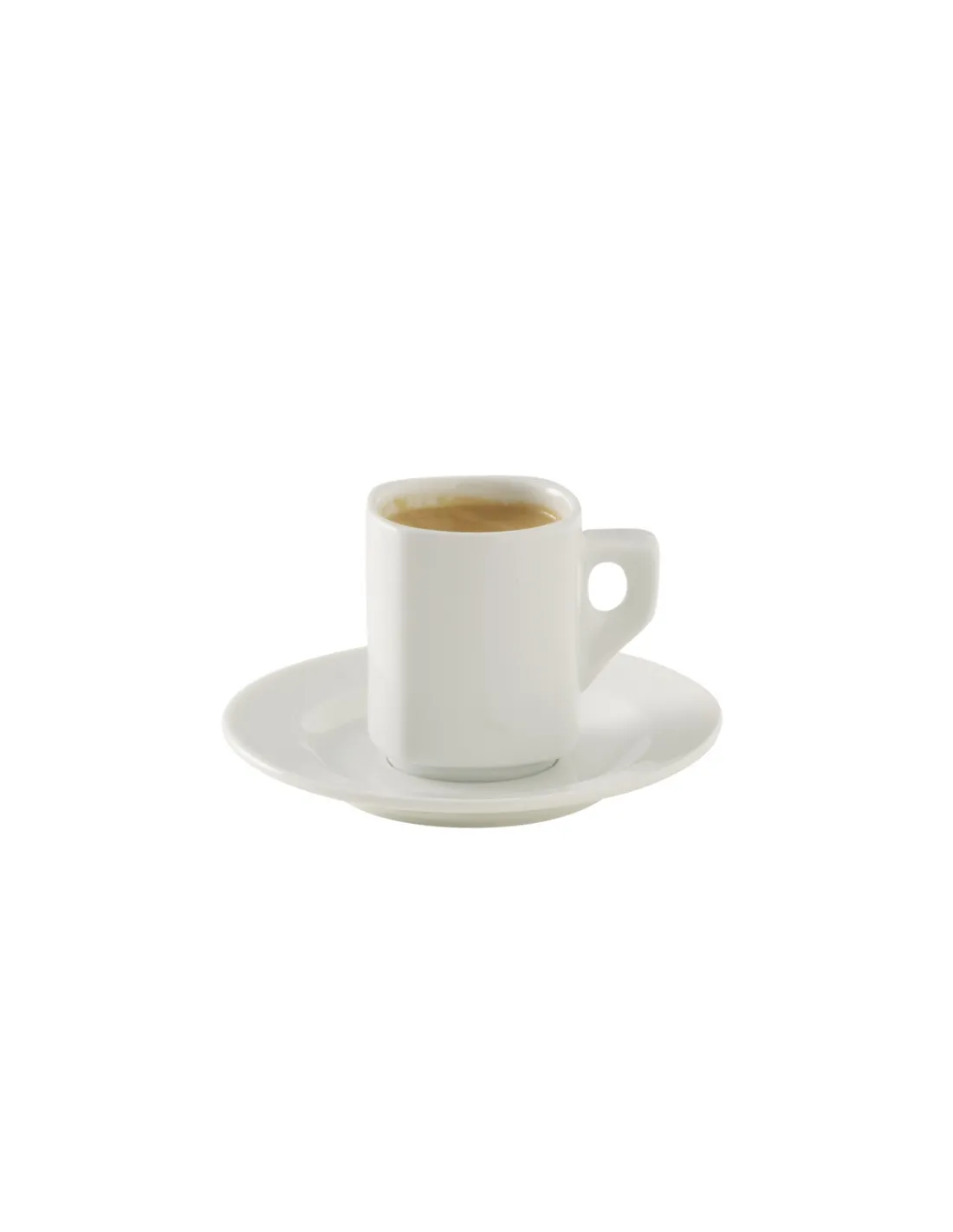 Taza de espresso redonda blanca de porcelana, con capacidad de 9 cl y diámetro de 5,2 cm. Su diseño apilable optimiza el almacenamiento y la limpieza, asegurando un servicio de calidad en entornos...